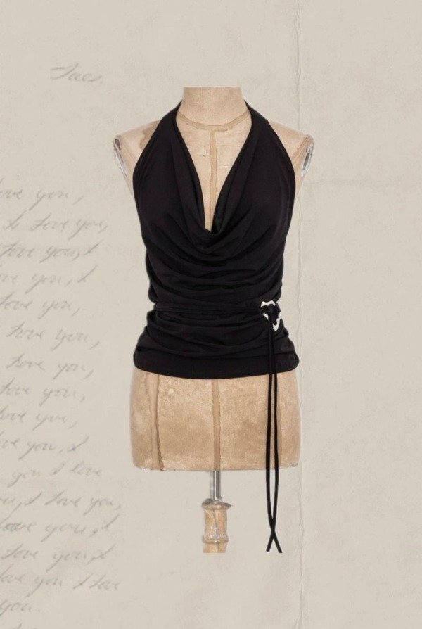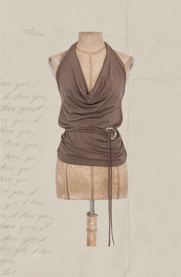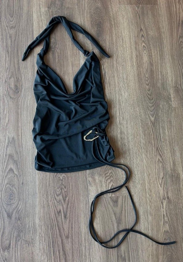 Top escote drapeado con tiras para atar al cuello y argolla al costado. Confeccionado en Ity (poliester y spandex).